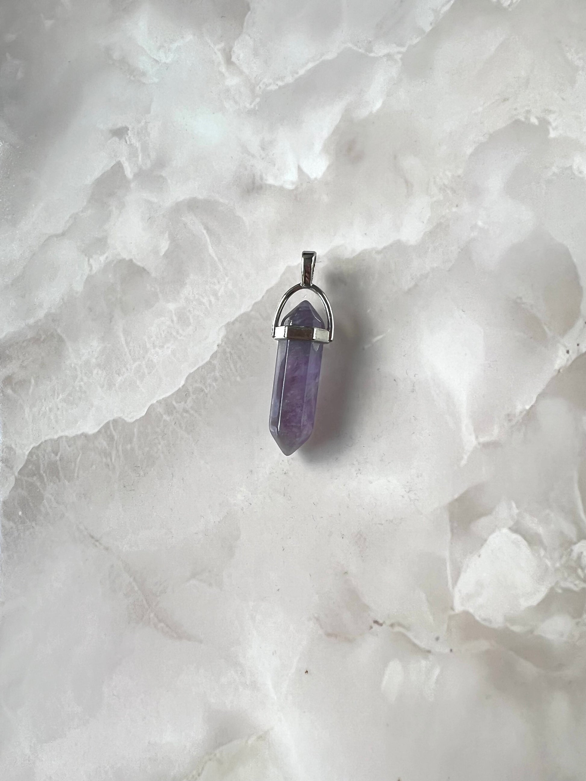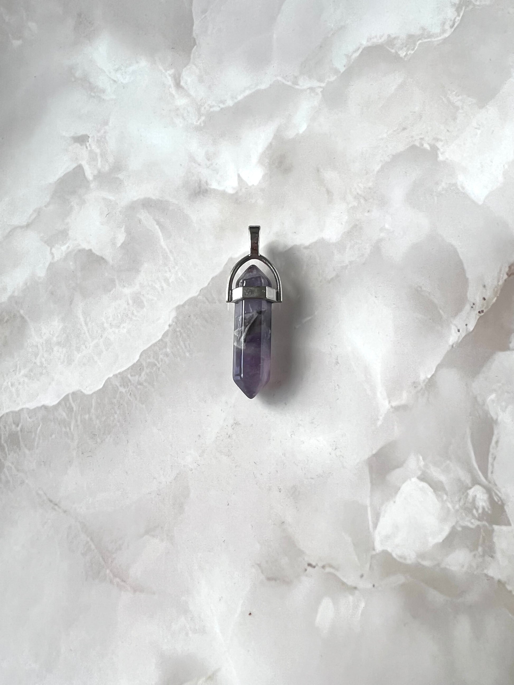 Deze hanger van amethist straalt diepe kalmte en spirituele bescherming uit. Amethist helpt je hoofd tot rust te brengen, bevordert innerlijke balans en opent de deur naar intuïtie en helderheid. Draag haar dicht bij je hart voor een gevoel van rust, helderheid en zachtheid.